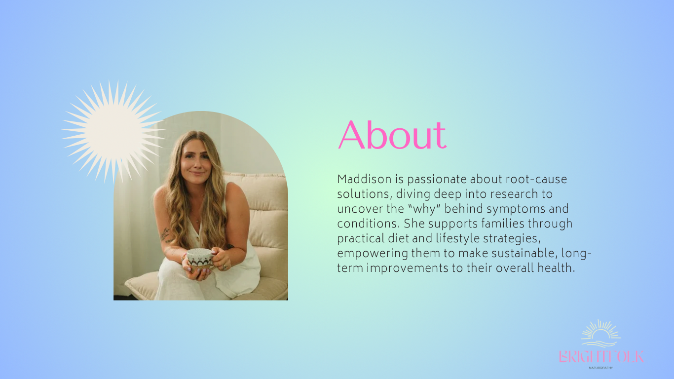 Hi, I’m Maddison, the heart behind Brightfolk Naturopathy. As a passionate naturopath and mum of three, I understand the importance of achieving balance in health, family, and life. Brightfolk was born from my desire to help individuals and families uncover the root causes of their health concerns, using evidence-based natural treatments to support healing and long-term wellness.